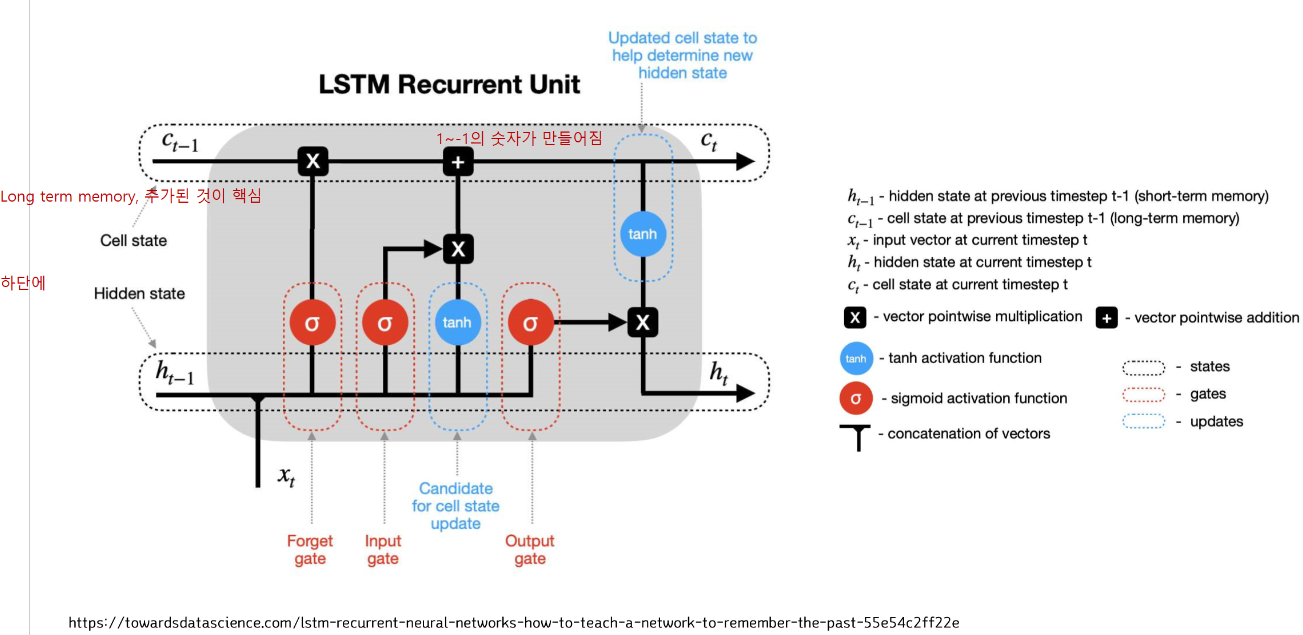 LSTM (Long short term memory) 의미 = 장기기억과 단기기억이 있다. 장기 의존성과 단기 의존성을 모두 기억할 수 있다는 의미