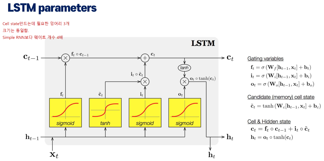 - 가중치 개수: `n_feature x n_lstm_units` (입력 데이터의 피처 수와 LSTM 레이어의 유닛 수에 따라 다름)
