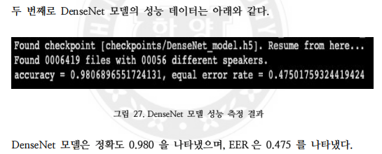 1. 본 논문에서는 ResNet 자체의 성능을 개선한 DenseNet 모델과의 비교를 통해 DenseNet 을 화자인식에 활용하더라도 유의미한 성능 개선을 이뤄낼 수 있을 지 검토