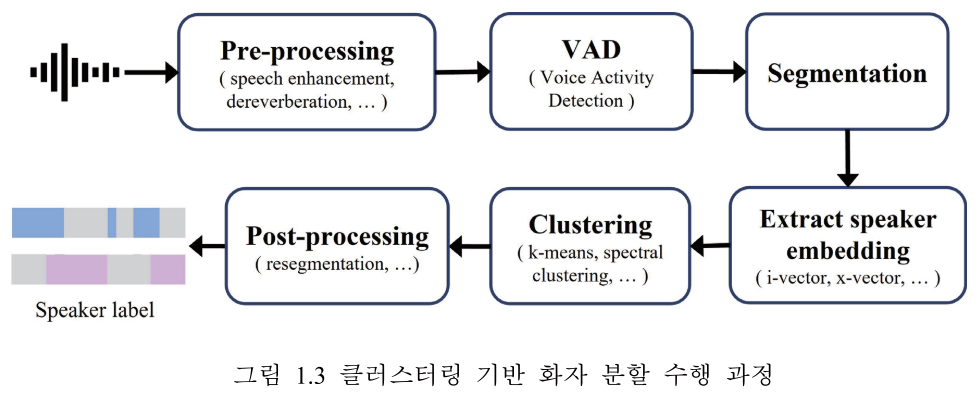 - 추출한 화자 특징은 클러스터링 기법(AHC, 스펙트럼 클러스터링 등)으로 각 세그먼트가 어떤 화자의 발화인지 분류